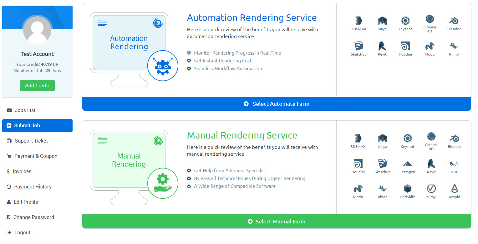 The first thing you need to do is to log in to your user panel. Then, select Blender render farm(automate farm)submission and choose your version of Blender – this should be based on your file settings.