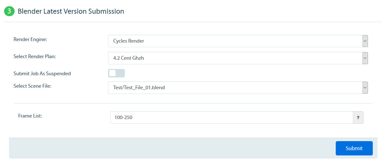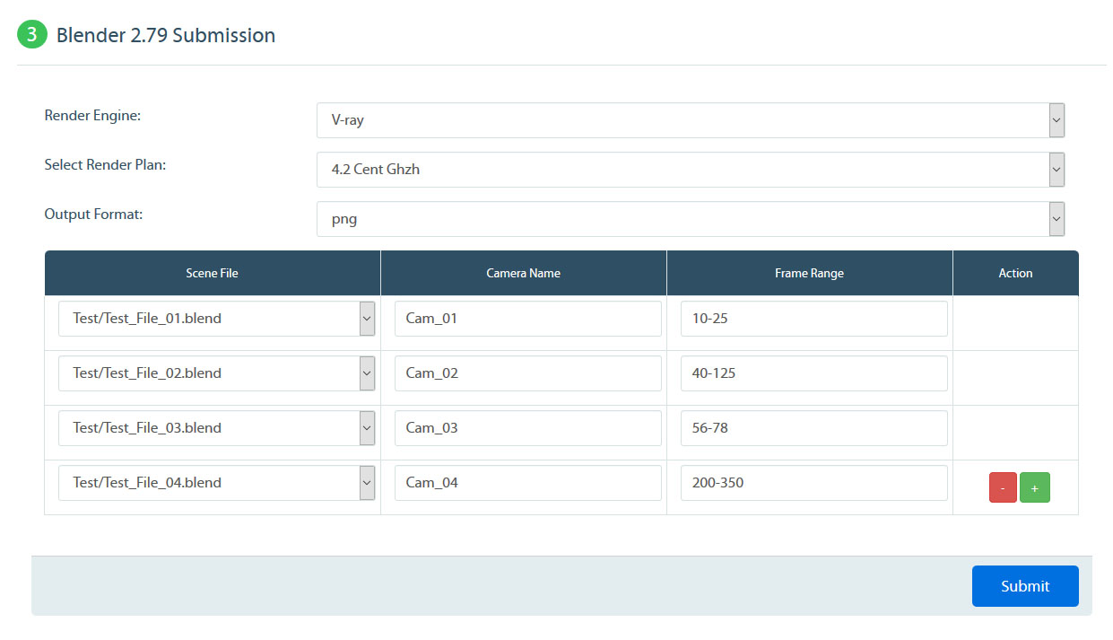 The inputs below are the essential submission details you will be required to fill before submitting your files. There is also a professional scene selection structured to allow you to submit multiple scene files with different camera names as well as frame range at the same time.